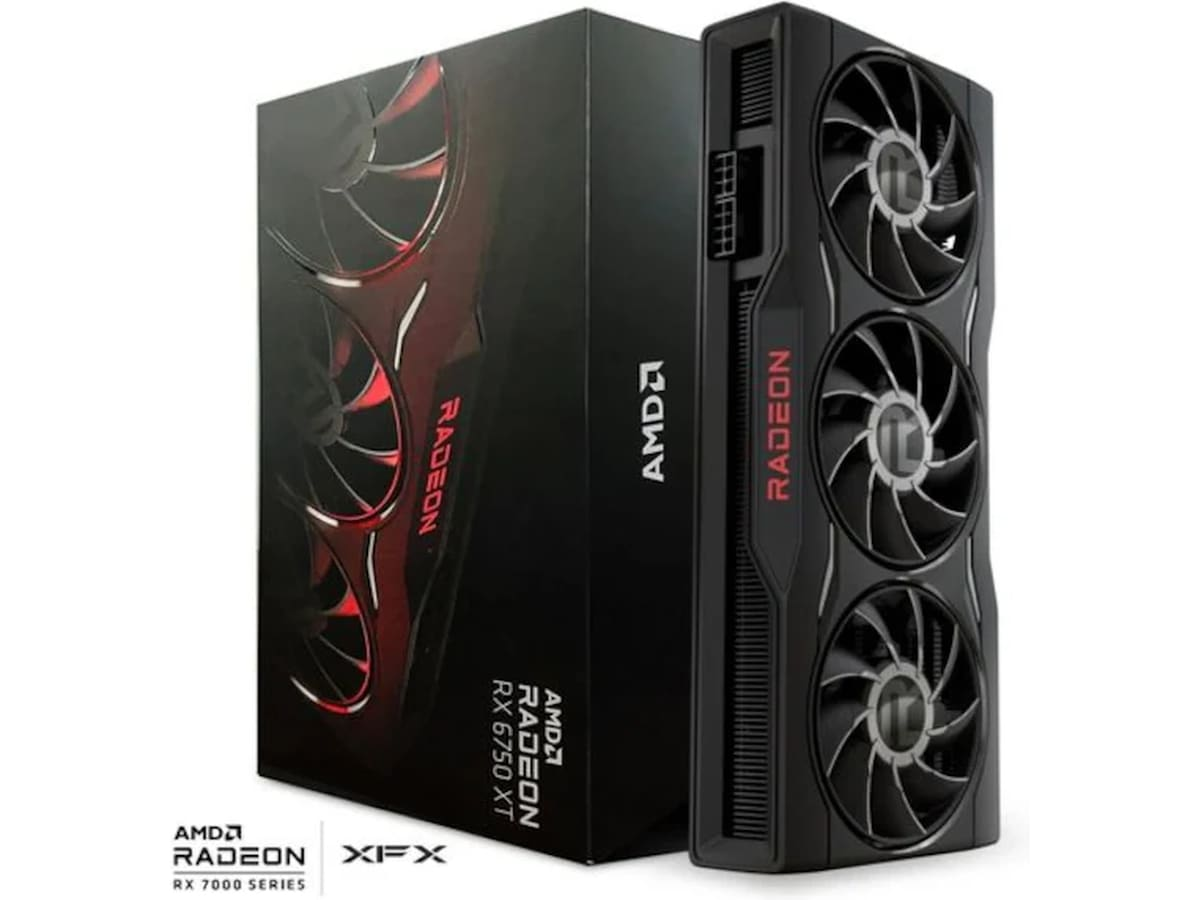 Et kraftig XFX RX 6750 XT-grafikkort. XFX RX 6750 XT gir lik ytelse som et RTX 5060-grafikkort.