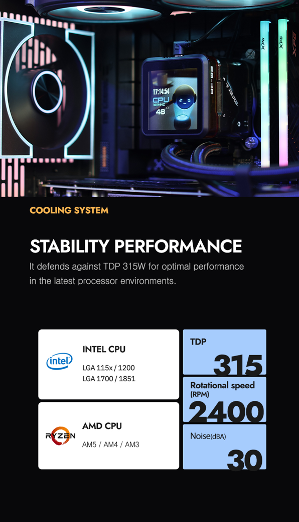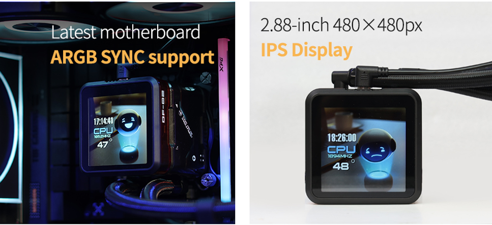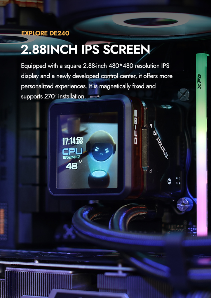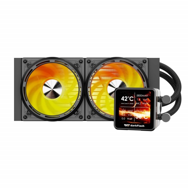DarkFlash DE240 vannkjøleren leverer bra med minimalt av støy. Den er utstyrt med et unikt LCD-display i høy oppløsning som man kan bruke til å tilpasse PCen sin.